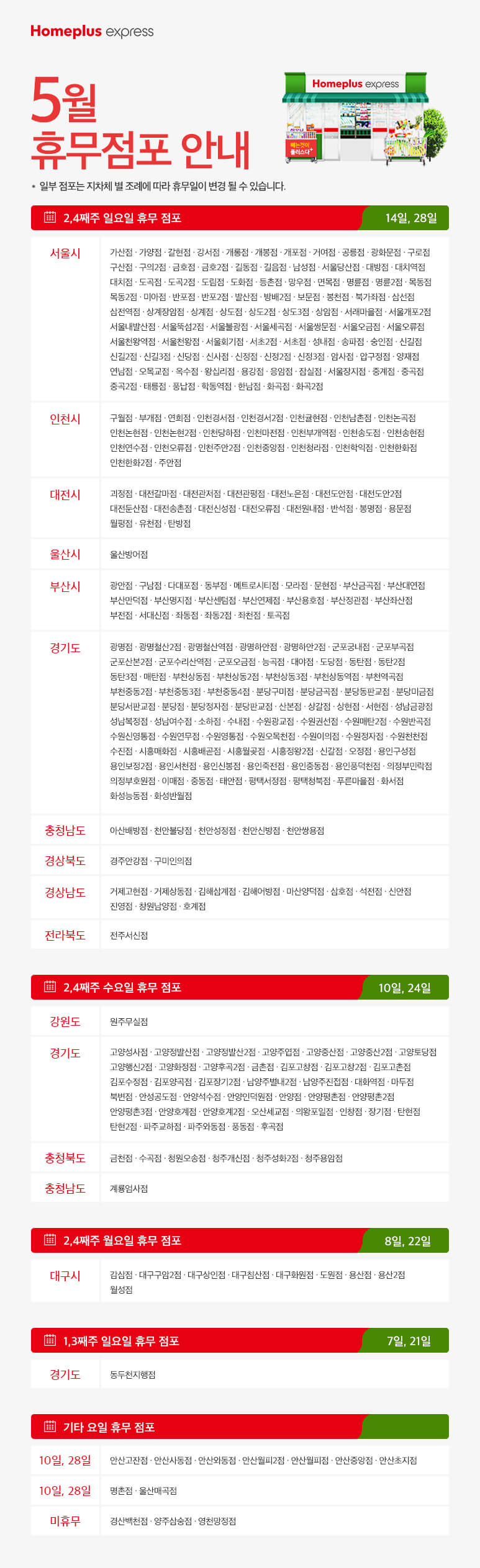 둘째, 넷째주 일요일 휴무 점포를 포함, 전국 매장별 휴무일을 홈플러스 공식 홈페이지에서 안내하고 있습니다.